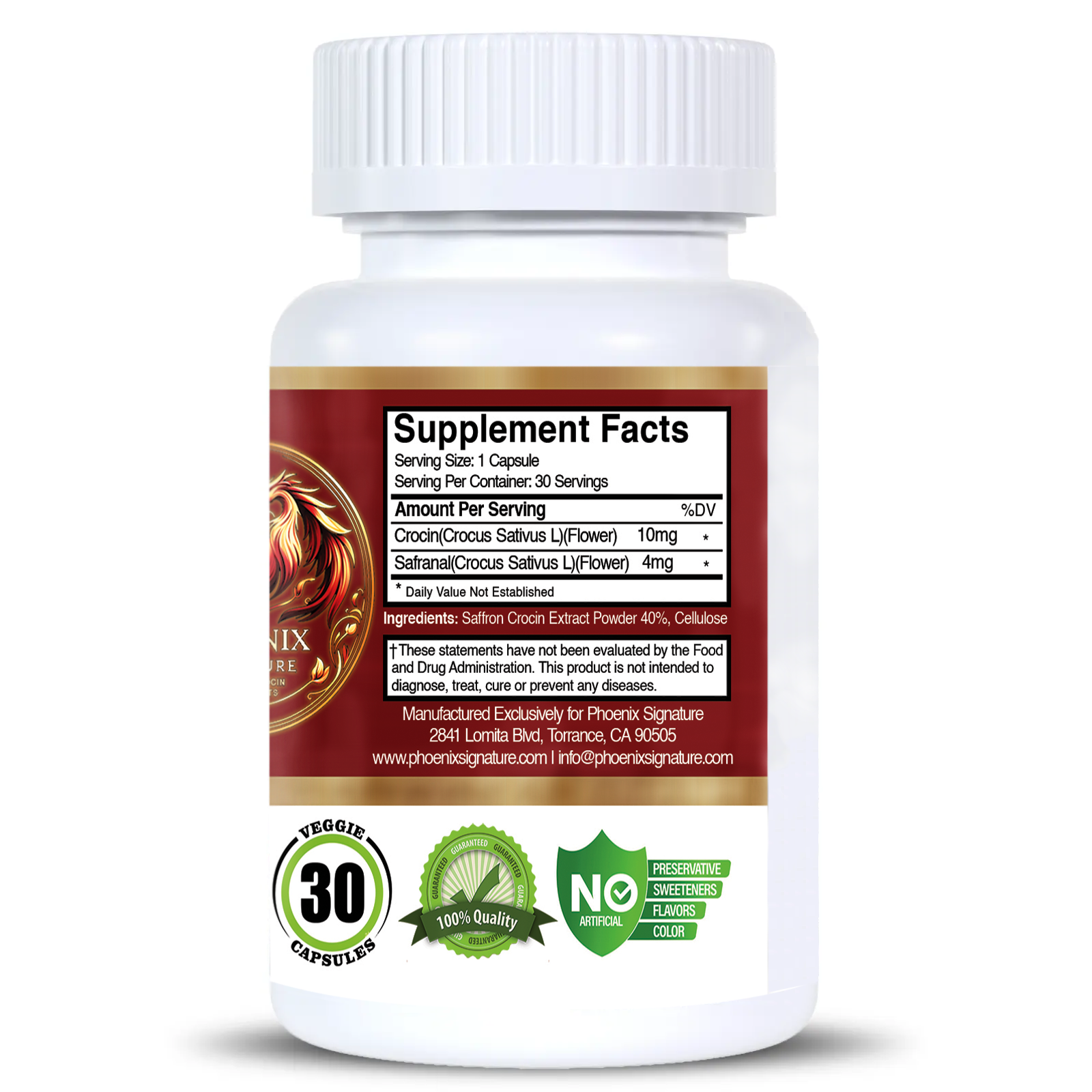 Each capsule provides 25mg of high-quality saffron crocin, standardized to 40% Crocus sativus crocin and 20% safranal — equivalent to approximately 3–5 grams of premium saffron threads.